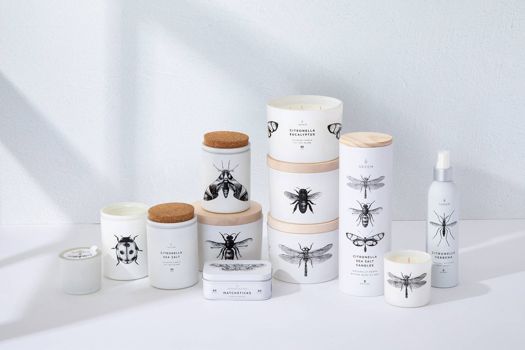 Our Citronella candles stylishly keep biting bugs at bay. Natural citronella oil will protect from pests by masking the smell they’re attracted to, while exclusive fragrances diffuse an inviting aroma into the air. Matte white vessels silkscreened with detailed entomological designs are a playful décor statement, offering an enchanting glow as the candles burn.